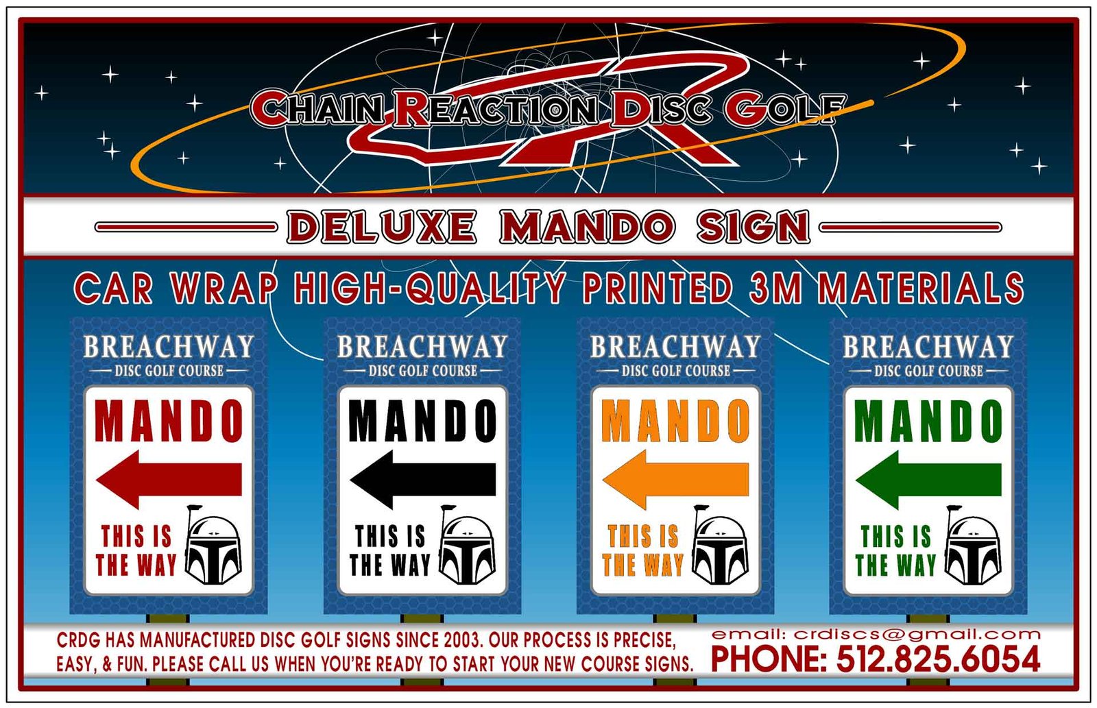 Our Mando signs are made with high quality, long-lasting materials, and will last for many years. The Aluminum blank is .063″ thick. None of the thin .040″ aluminum blanks—like some other disc golf sign makers use.
