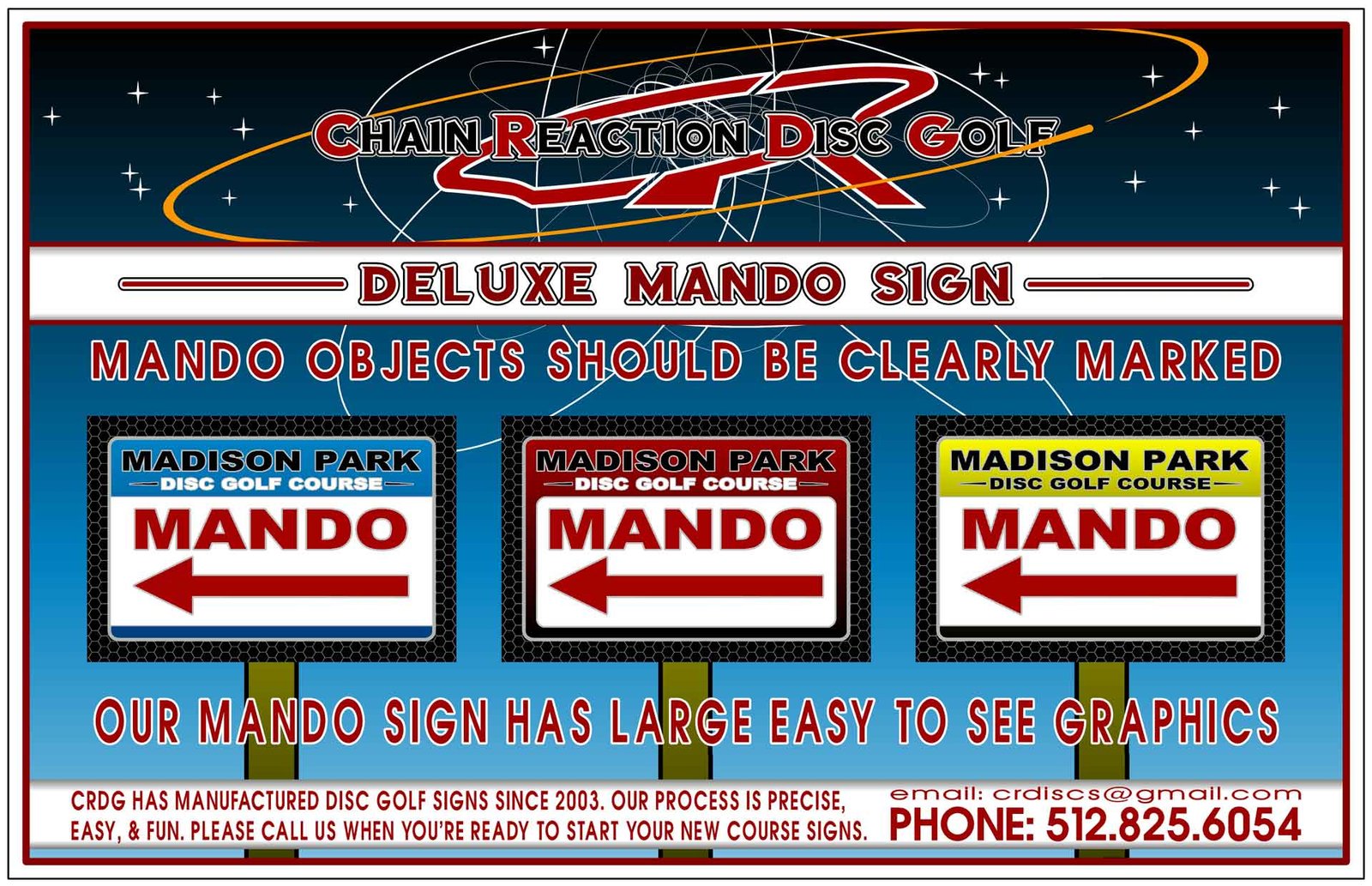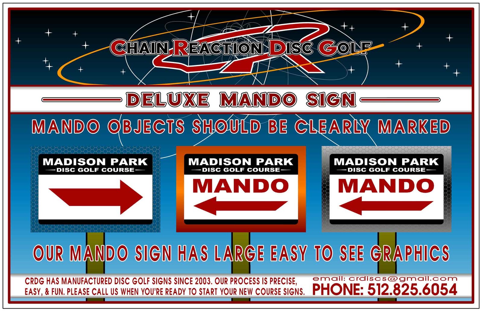 A MANDO SIGN is recommended for a hole that has a MANDATORY object or dogleg. A MANDO is an object (usually a tree or pole) in the fairway of the hole, which MUST BE thrown around the direction the arrow points. Note! If the Mando Dog-leg isn’t marked–it won’t be played correctly, and it also won’t be safe!