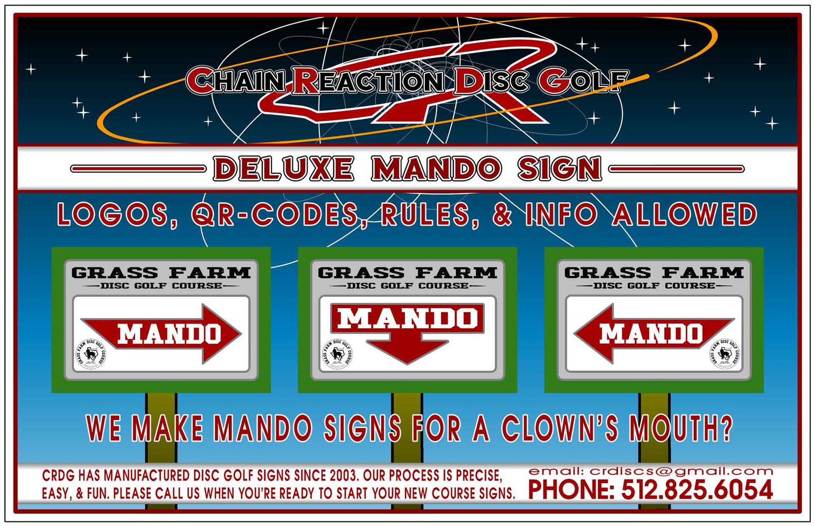 CRDG makes the SIGN PROCESS very easy from start to finish. Please call us at: 512.825.6054 or Contact-Us for instructions that explain our easy sign process. We will custom design Mando signs for your course and the process will be quick.