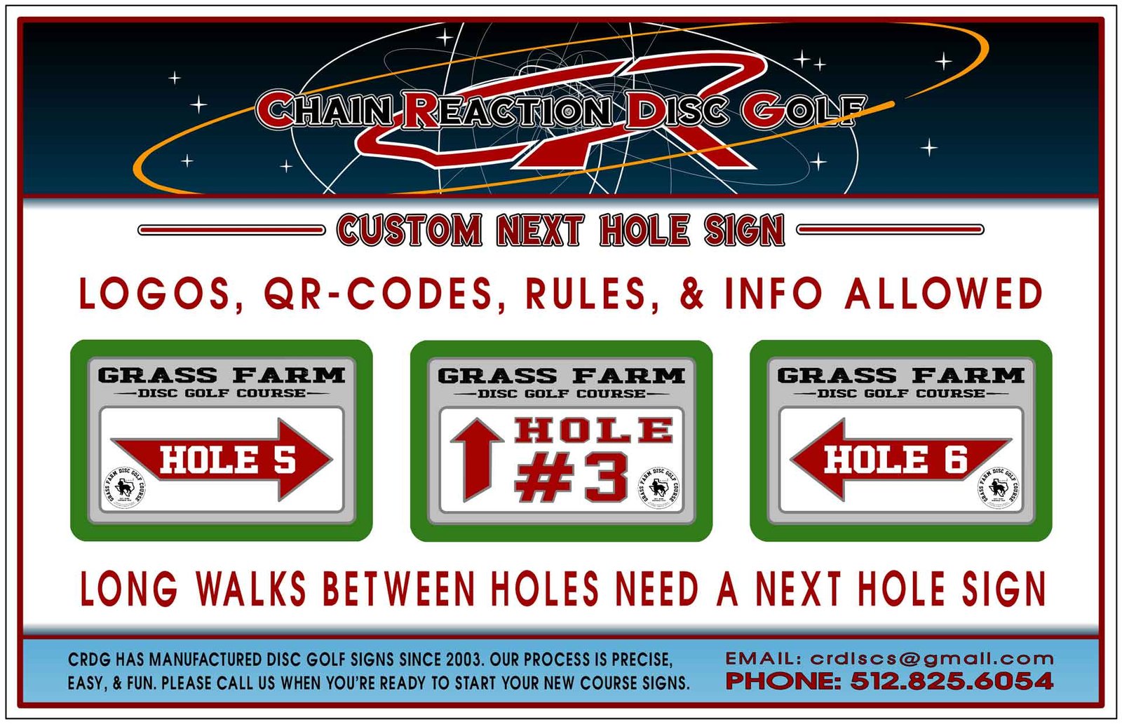 We manufacture our disc golf course Next Hole Sign and 1st Hole Sign in beautiful full color designs, which we can customize to match your course’s existing signs. The sign can include custom directions, arrows, logos, and the course or park’s name. We highly recommend a Next Hole Sign, or maybe 2, between holes that have long walks from a target to the Next Hole’s tee box!