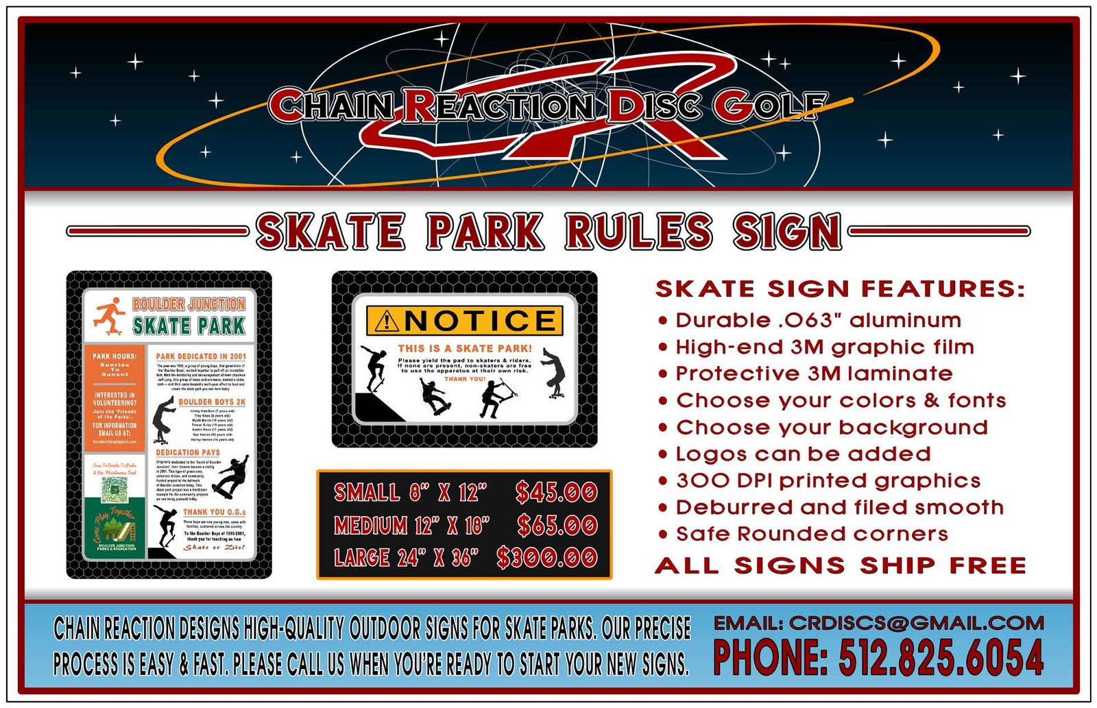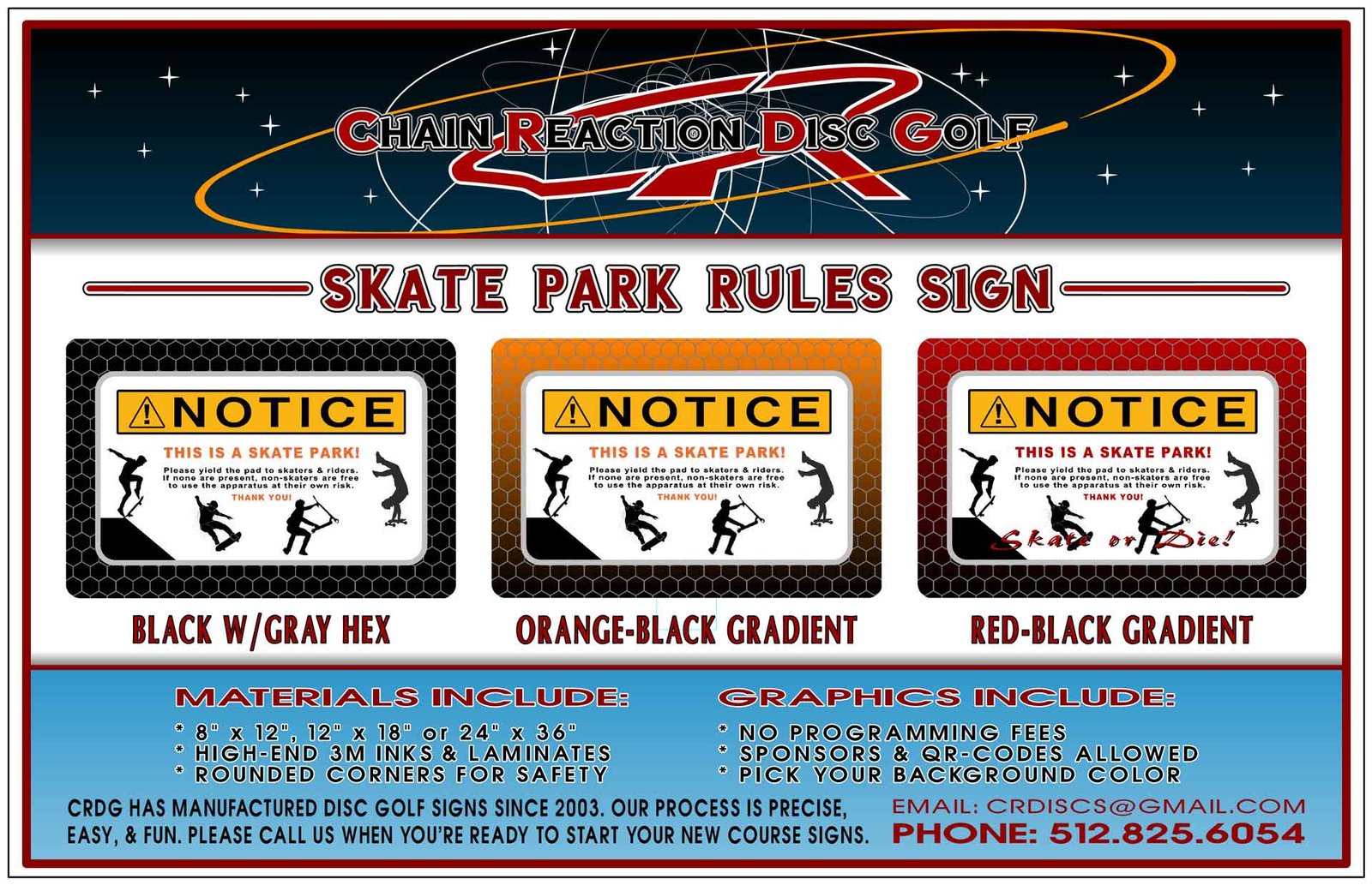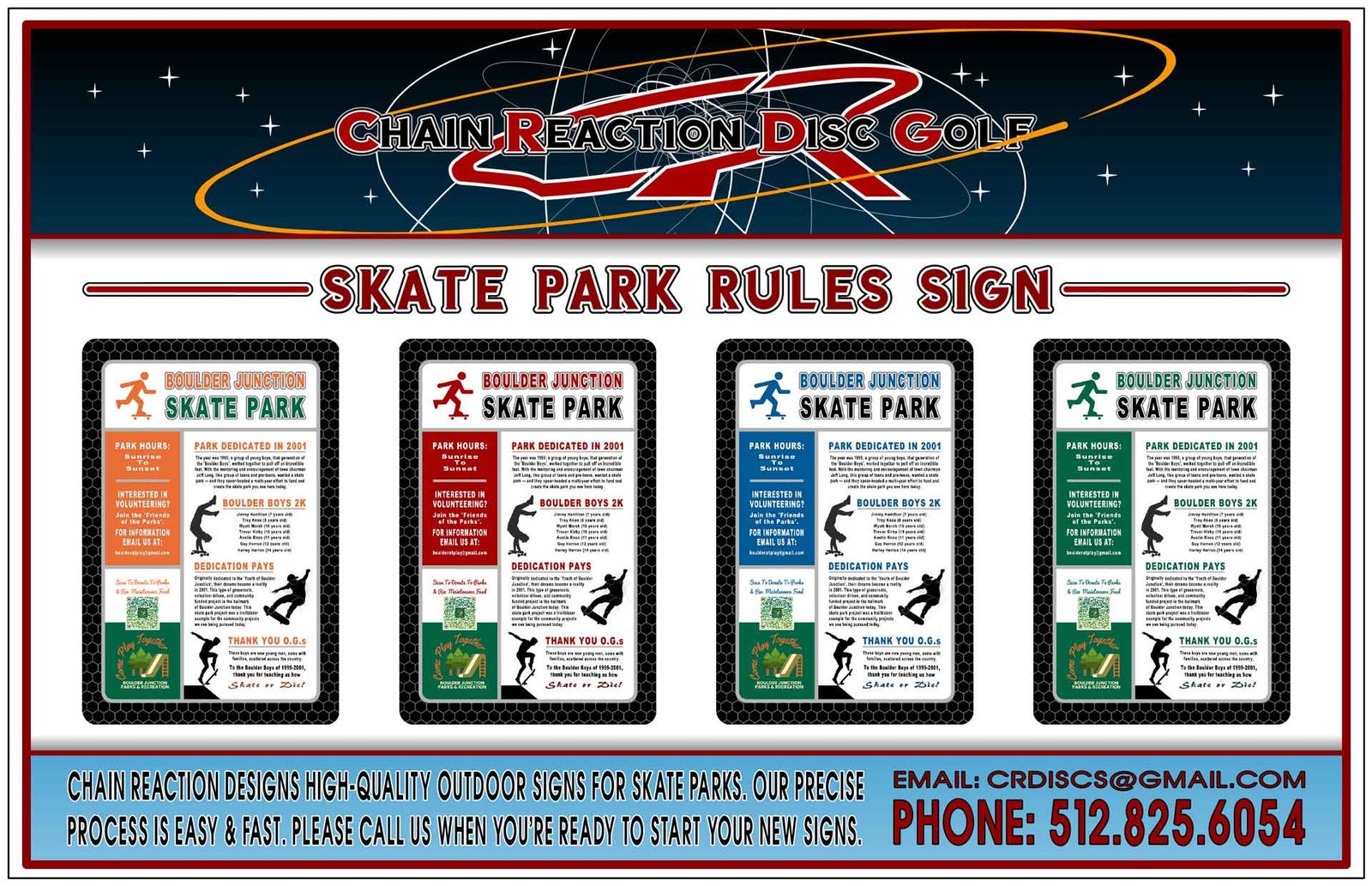 We also recommend smaller signs placed around the outer fence or barrier. Chain Reaction’s graphics dept. can design smaller Skate Park Rules Signs that can show plenty of rules. There’s no programming charges for our graphic design work and shipping is free.