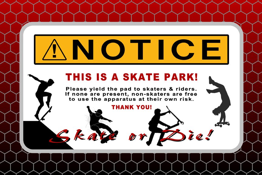 Our Skate Park Signs are available in [small: 8″ X 12″], [medium: 12″ X 18″], and [large: 24″ x 36″]. The large sign is perfect for the Skate Park’s entrance. It will show skaters and non-skaters the park’s complete set of rules. The sign is BIG and can easily display more precise instructions and information. We will help you design a sign that shows any pertinent information you’d like to add—logos, skater action graphics, rules, hours, thank you/sponsors section, and skate park history. We’ll create something that makes-it-yours!