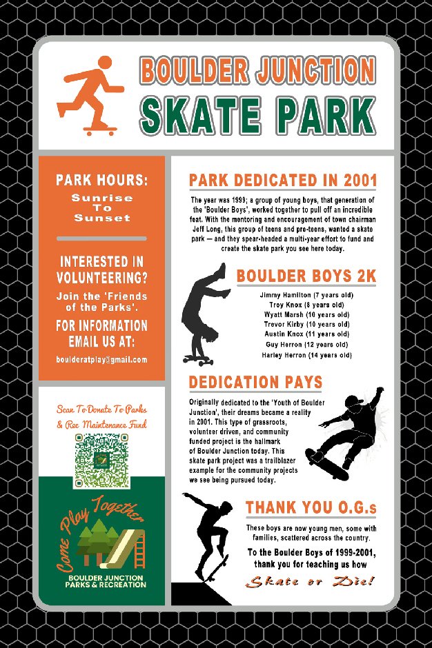 CRDG manufactures our Skate Park Rules Sign in printed full-color designs, which we can customize to match your park’s signs, or an updated modern look. The sign can include custom rules, graphics, logos, QR-Codes, sponsor’s names, a thank-you and history section, and of course—the Skate Park’s name. We highly recommend a Skate Park Rules Sign (maybe a couple) between entrances & obstacles that may need to show the park’s most important skater rules.